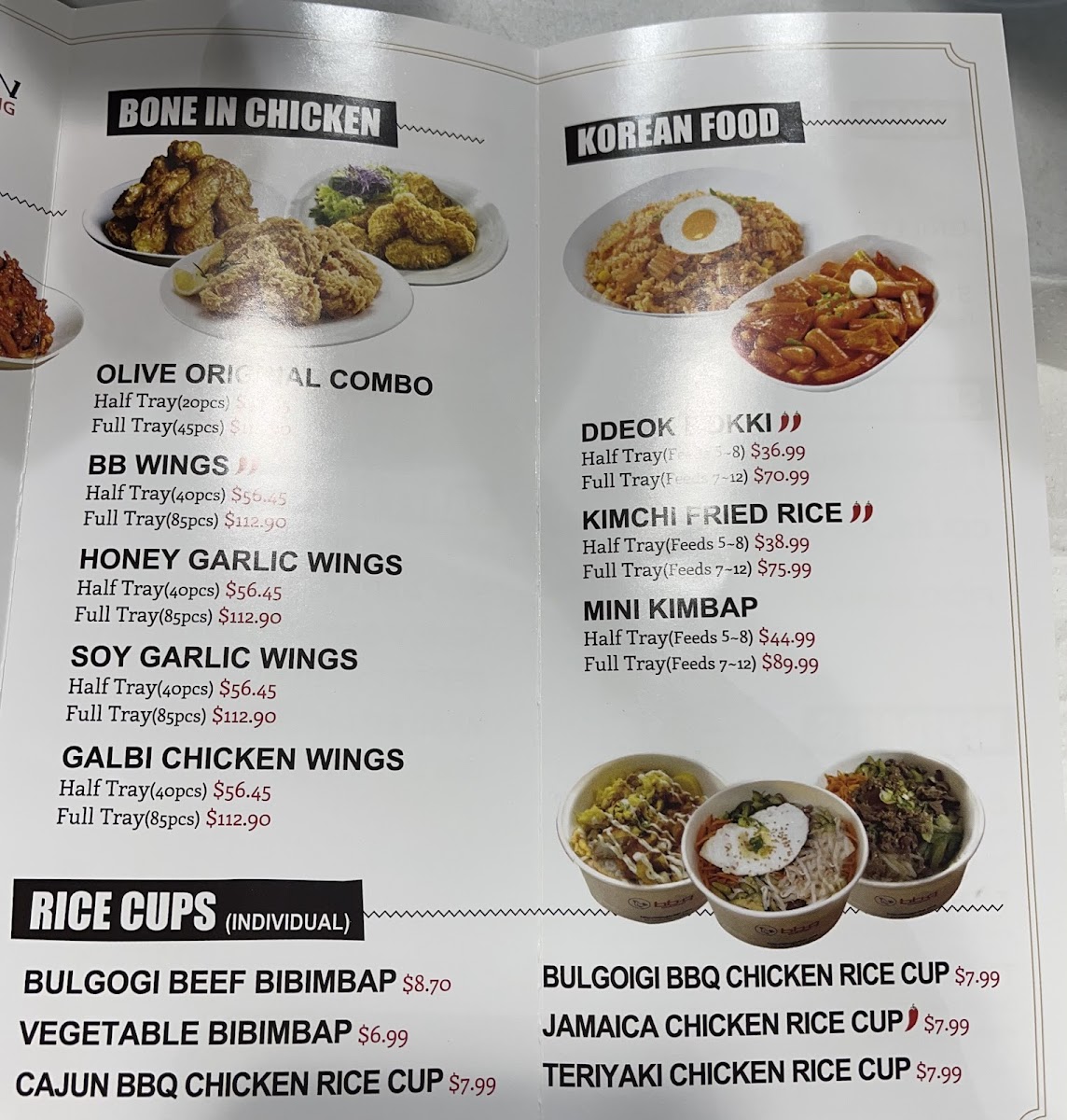 The menu features a delightful array of options, including the Cajun Triangular Kimbap and Gochujang Galbi Triangular Kimbap, both priced at just $3.44. Adjacent to these offerings, the boneless chicken varieties shine. The Sweet & Salty Garlic Boneless is a standout, boasting a perfect blend of crispy texture and rich flavors for $18.39.